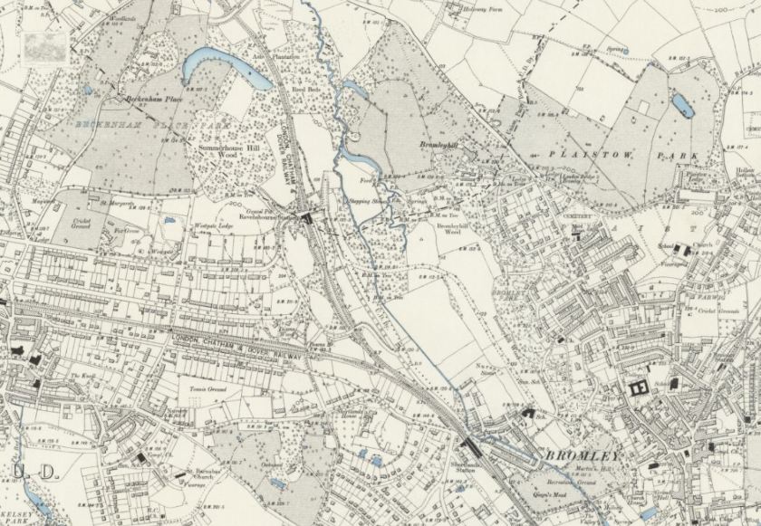 This map now shows the Catford Loop Line, Downs Hill (with no houses) and Ravensbourne Avenue (then Ravensbourne Road) upon which there was just one house. Bromley Avenue was just a spur running to a gamekeeper's cottage (now No. 12).