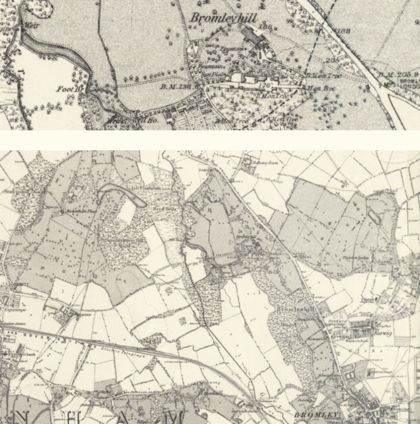 It is essentially how the Bromley Hill Estate looked when owned by Lord Farnborough between 1801 and 1838 - remaining the same until 1880 when it was sold to Samuel Cawston. The first image below is detail from the picture below it. Both images are courtesy of reproduced with the permission of the National Library of Scotland where high resolution maps can be found.