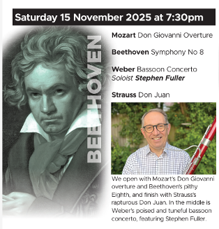 There is to be a concert on Saturday 15 November at 7:30pm at Langley Park Centre for the Performing Arts. It opens with Mozart’s Don Giovanni overture and Beethoven’s pithy Eighth, and finishes with Strauss’s rapturous Don Juan. In the middle is Weber’s poised and tuneful bassoon concerto, featuring Stephen Fuller.
