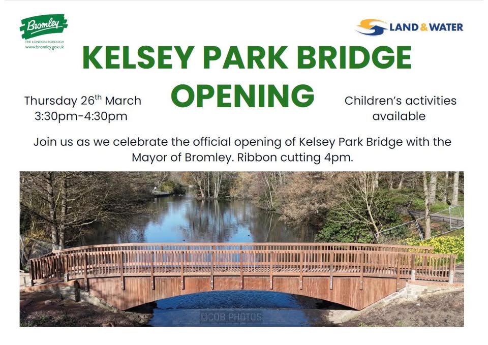 Bromley Council Parks Engagement Team are delighted to confirm that the Mayor of Bromley will formally open the refurbished Kelsey Park Bridge on Thursday 26 March, between 3:30pm and 4:30pm (with a ribbon cutting at 4pm). They hope that residents will be able to join the celebration of this important milestone.