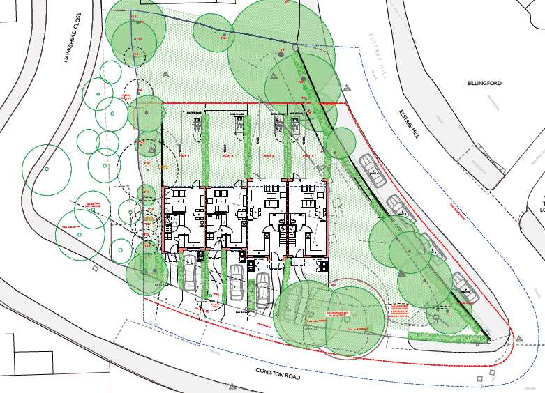 The report continues:The site is a corner plot with a retaining wall along the frontage to Elstree Hill which is at a lower level. The rear garden is terraced down to the west. The proposal is to demolish the existing house and garage and to construct a terrace of 5 houses facing the Coniston Road frontage. There is parking provision to the front of each house, but in addition the land within the applicant’s ownership along the southern side of Elstree Hill will be used for parking.