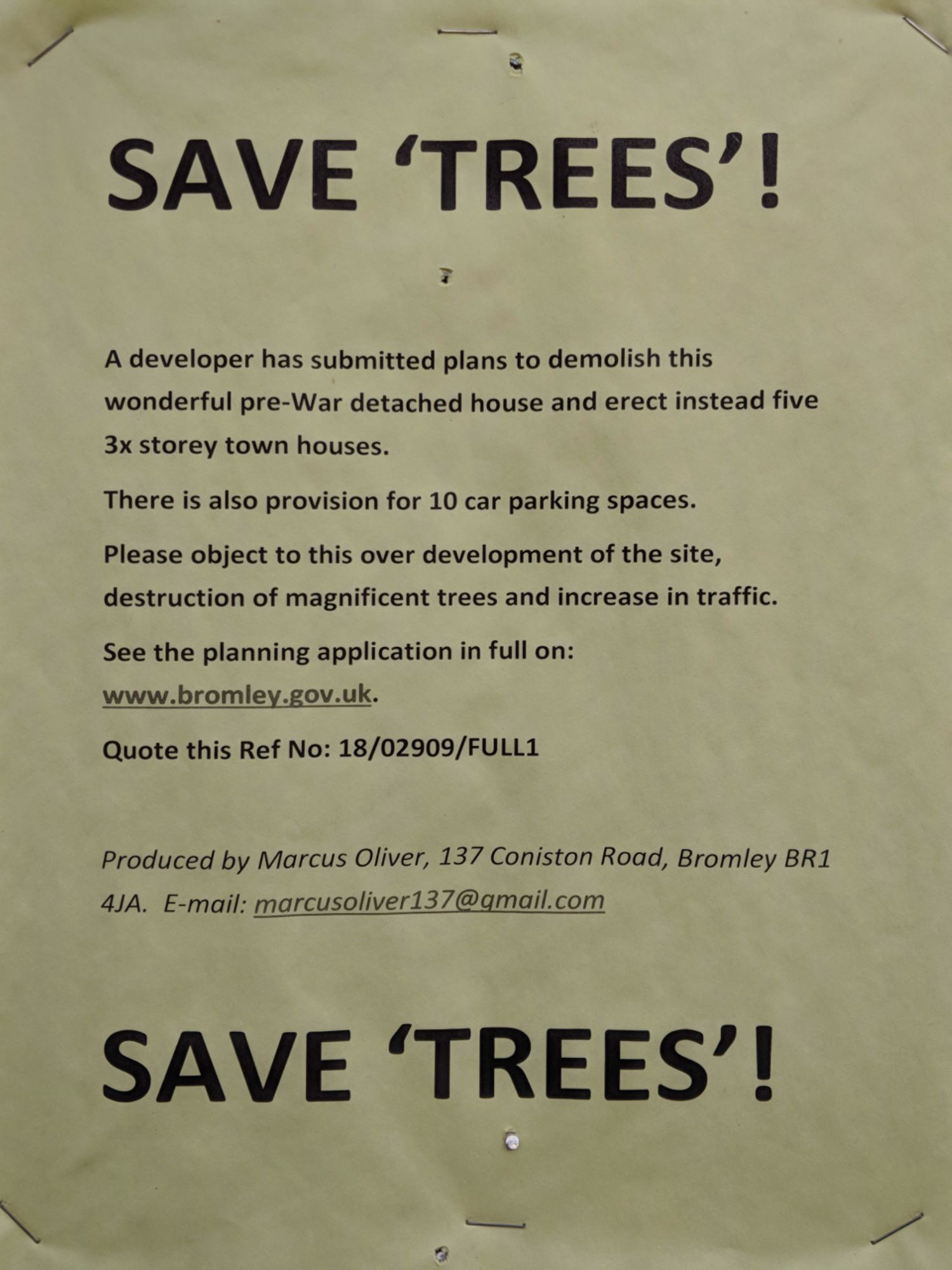 A number of objections are now to be found on the file of the planning application, ref. No. 18/02909/FULL1, for the demolition of the existing dwelling and detached garage and erection of a three storey terrace of 5 dwellings (2 × 4 bedrooms and 3 × 3 bedrooms) with associated car parking, landscaping, cycle and refuse storage at Trees, Coniston Road, Bromley BR1 4JB. See for example the objections which were filed by Mr Marcus Oliver on 15 July and 29 July 2018.