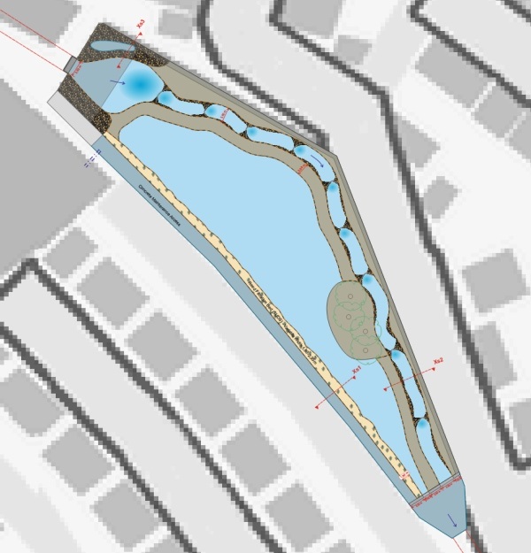 [The latest idea for the pond is for an] optional causeway that runs parallel to the footpath and planted with reeds. This is to filter and clean the drain water coming into the pond. Let me know what you think about this, it can be made shorter or eliminated entirely. The drawing attached shows the current weir still in place and the river flowing through it, I am proposing that this weir is removed entirely and a short wall built between the island and eastern wall. I think this will give a better vista when looking from the bridge with the river flowing around vegetated gravel banks.