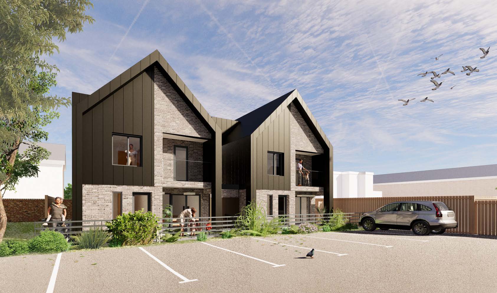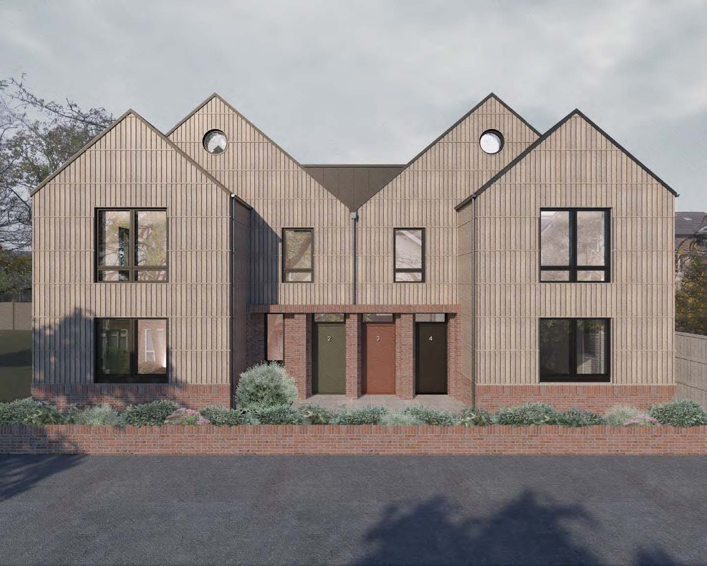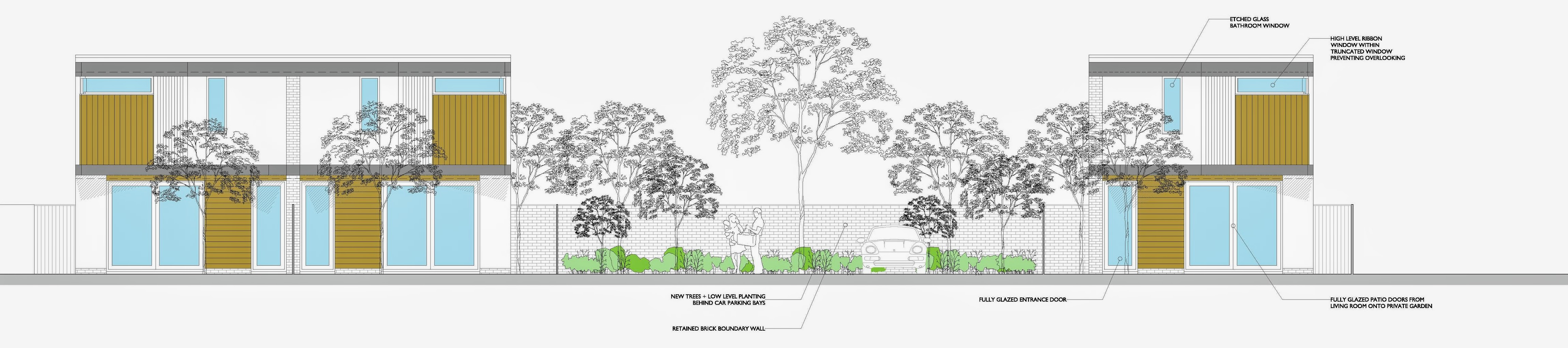 The proposal includes the retention of the mature trees in the north-west corner of the site. This defined the positioning of the new houses, located away from the “crown and root balls”.