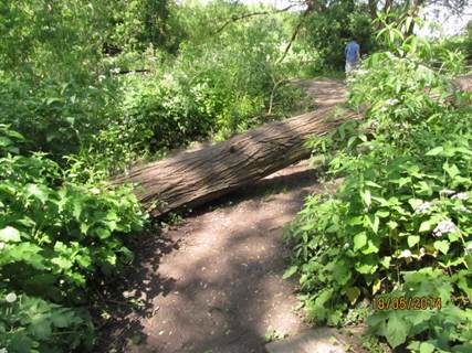 Following the storms last year, three trees have fallen and blocked the path. Many residents very much enjoy walking along this path but are hampered by the trees. We have asked David Walton, Leisure Manager at London Borough of Lewisham, to arrange for them to be cleared. See the following (multiple pictures are shown but there are in fact only three fallen trees across the path):